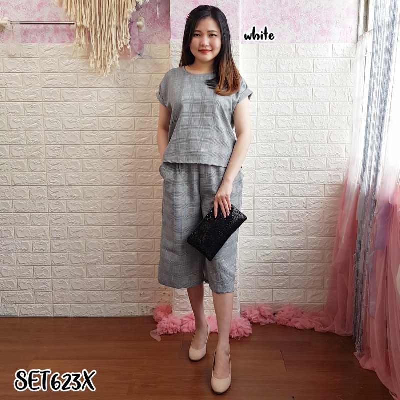 Setelan baju tunik kombinasi motif kotak dipadukan dengan celana panjang yang serasi.